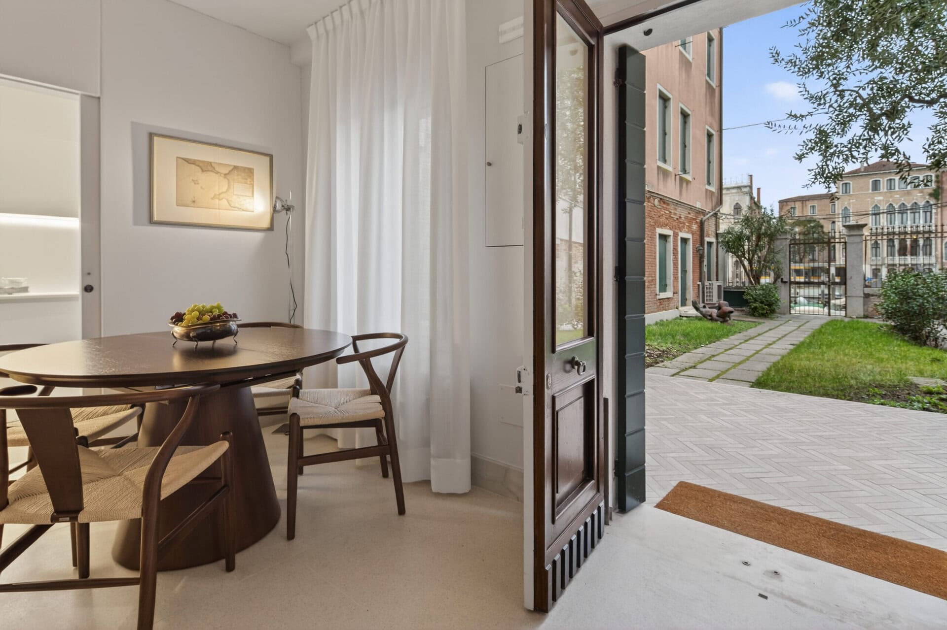 Ca’ del Pescador is a rare Venetian home: a three-storey house filled with natural light, with a private garden and an extraordinary front-row view over the Grand Canal, facing the Ca’ d’Oro. On the ground floor, an inviting living area unfolds into a lounge, dining space and fully equipped kitchen, along with a convenient guest bathroom. The first floor features a double bedroom with an en-suite bathroom, alongside a second bedroom with a small double bed (one-and-a-half), plus an additional bathroom on the same level. The top floor hosts a single bedroom with its own bathroom and a beautiful terrace looking out over the garden and the Grand Canal. Interiors are thoughtfully curated, creating a warm, elegant atmosphere without feeling formal.