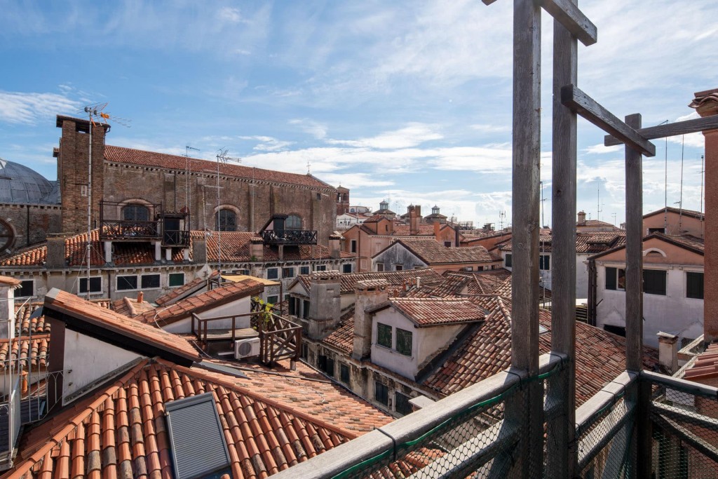 Questo è uno di una serie di 4 appartamenti che compongono l’intero edificio e che possono essere affittati insieme per una frande famiglia o un gruppo di amici così da garantire una sistemazione comoda senza rinunciare alla privacy. Questo appartamento al 4° piano è il più grande tra quelli presenti nell’edificio e si compone di 1 camera matrimoniale, 1 ampio bagno con doccia e 1 bagnetto con wc, una moderna cucina attrezzata con tavolo per 6 e un salotto con ampio divano ad angolo. Al piano superiore c’è una mansarda con la seconda camera matrimoniale e un comodo accesso ad un’altana, tradizionale terrazza veneziana con vista sui tetti. L’appartamento è arredato con gusto moderno con dettagli tradizionali come le travi in legno a vista, tipiche degli appartamenti veneziani.